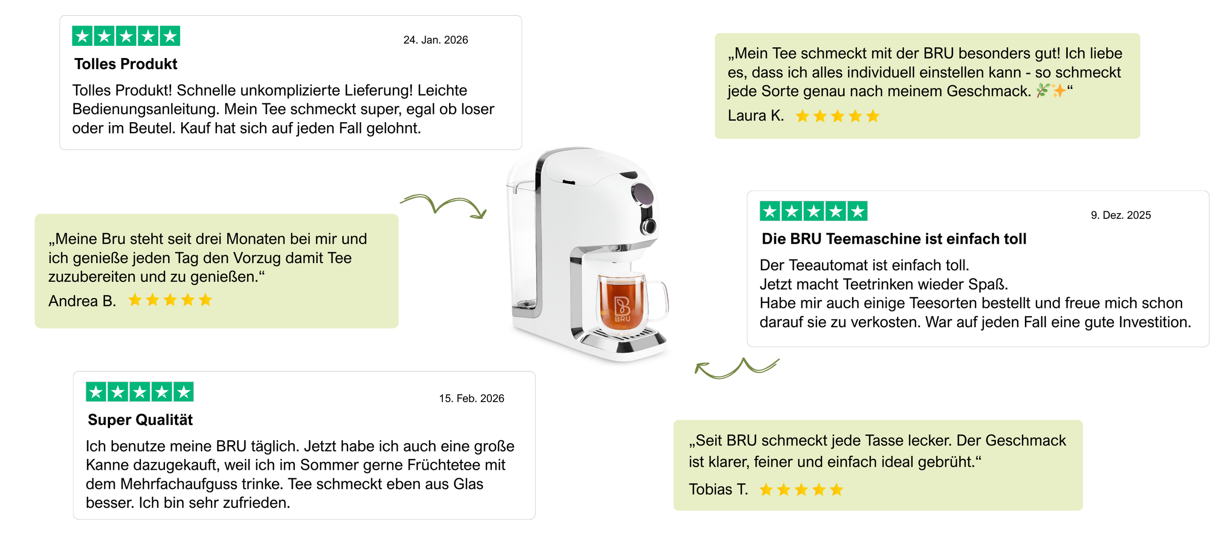 Alternativ kannst du uns auch per E-Mail unter support@bru-tea.com erreichen und wir antworten in der Regel innerhalb von 24 Stunden.