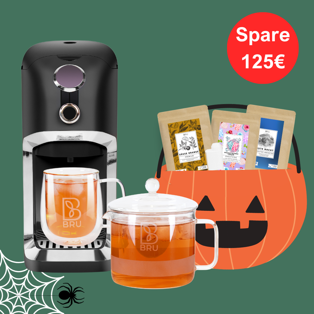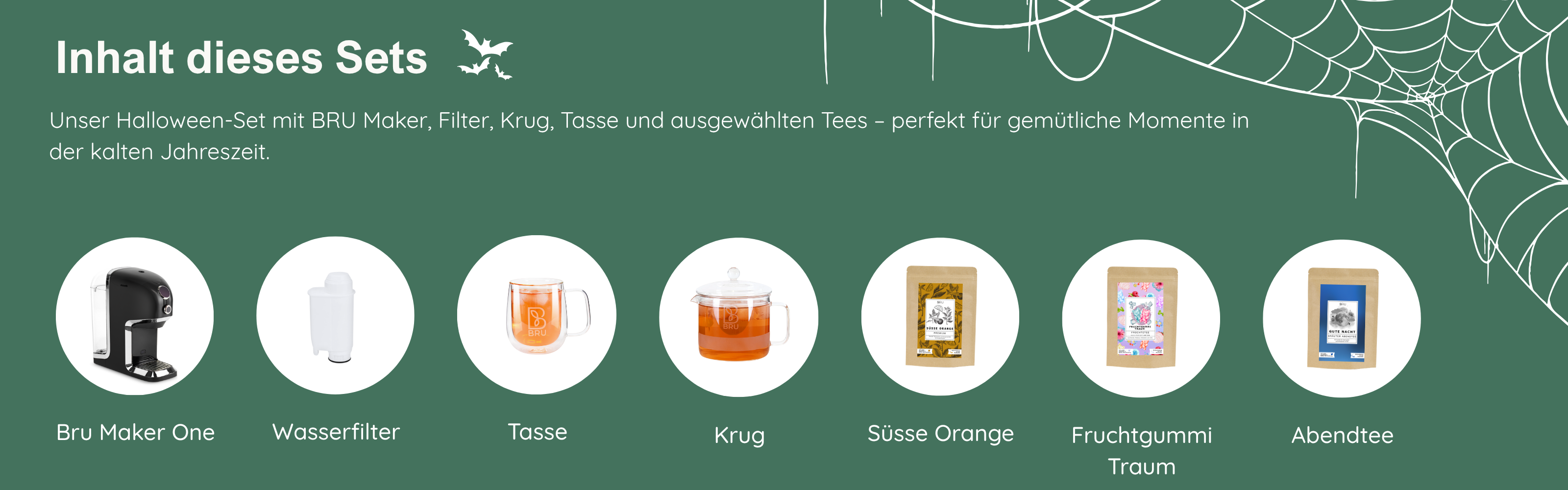 Mit dem BRU Maker One + Filter + Tasse + Krug und drei köstlichen Tees – Süße Orange, Fruchtgummi Traum und Abendtee.
