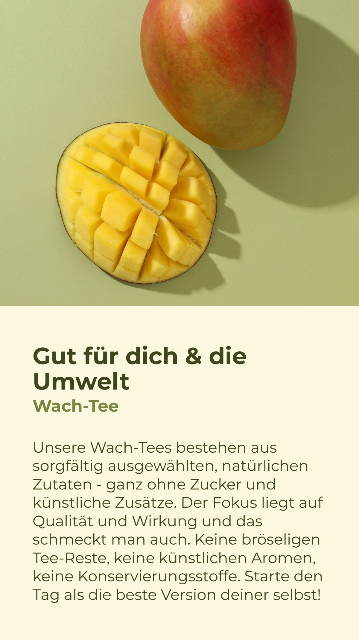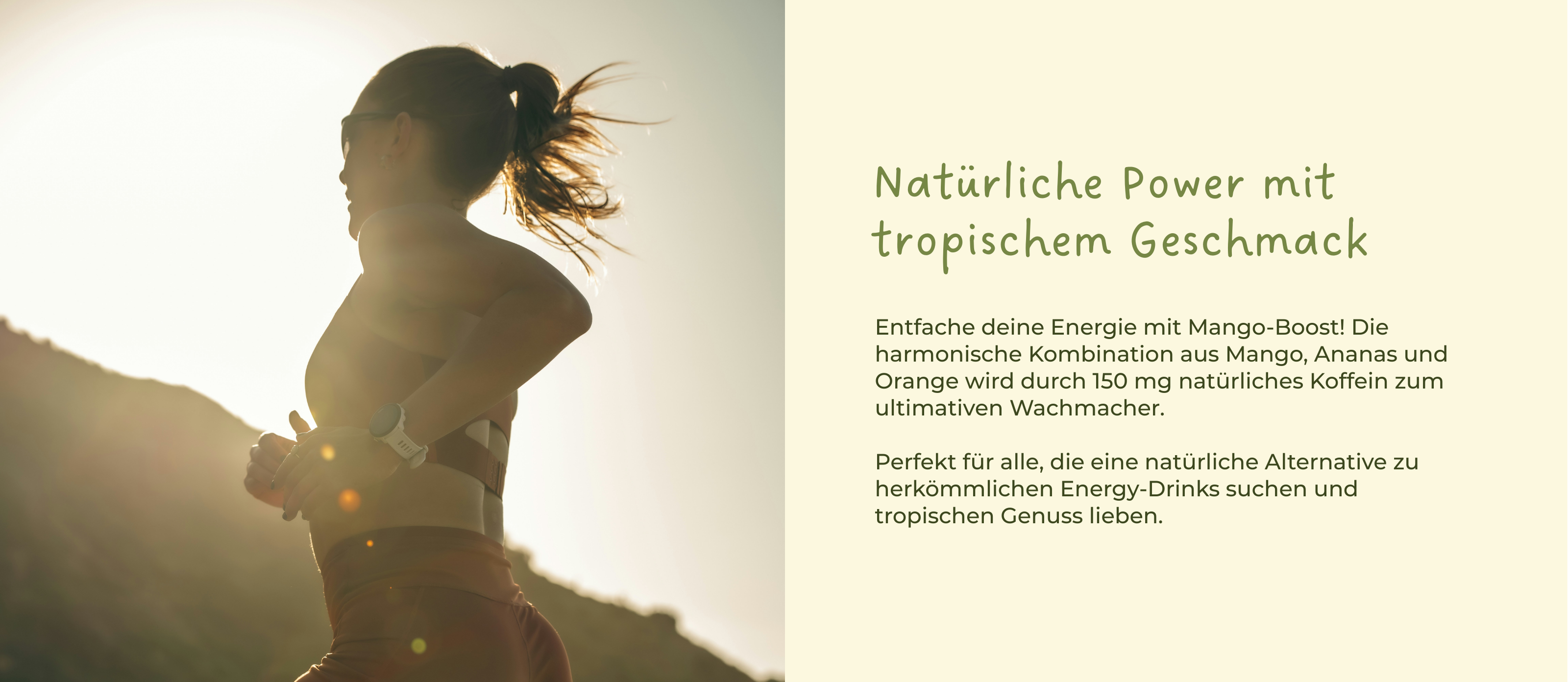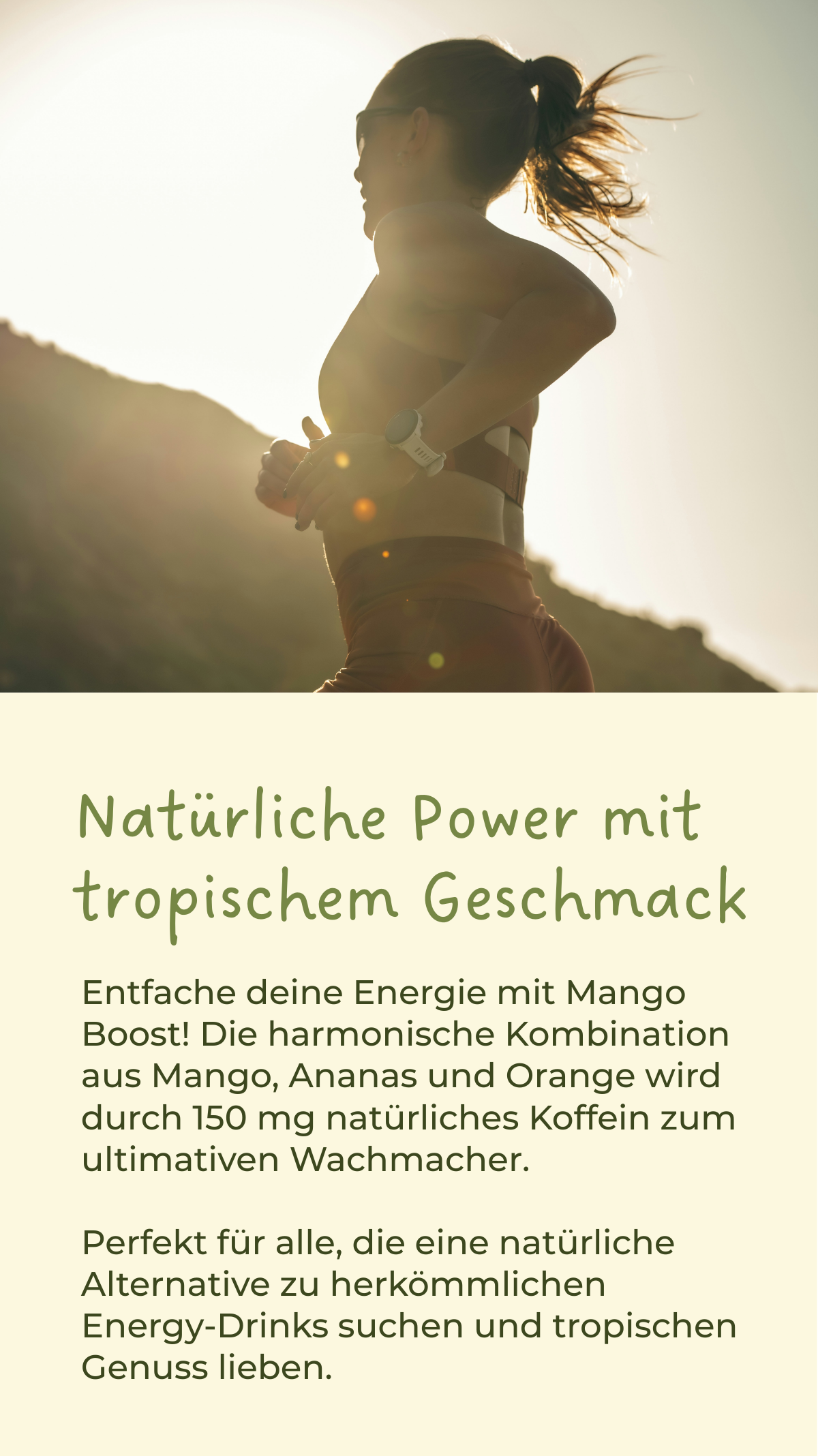 Mango Boost: Die exotische Kombination aus Mango, Ananas und Orange liefert nicht nur Geschmack, sondern auch Energie – dank natürlichem Koffein. Perfekt, um dich auf natürliche Weise zu erfrischen und zu beleben.