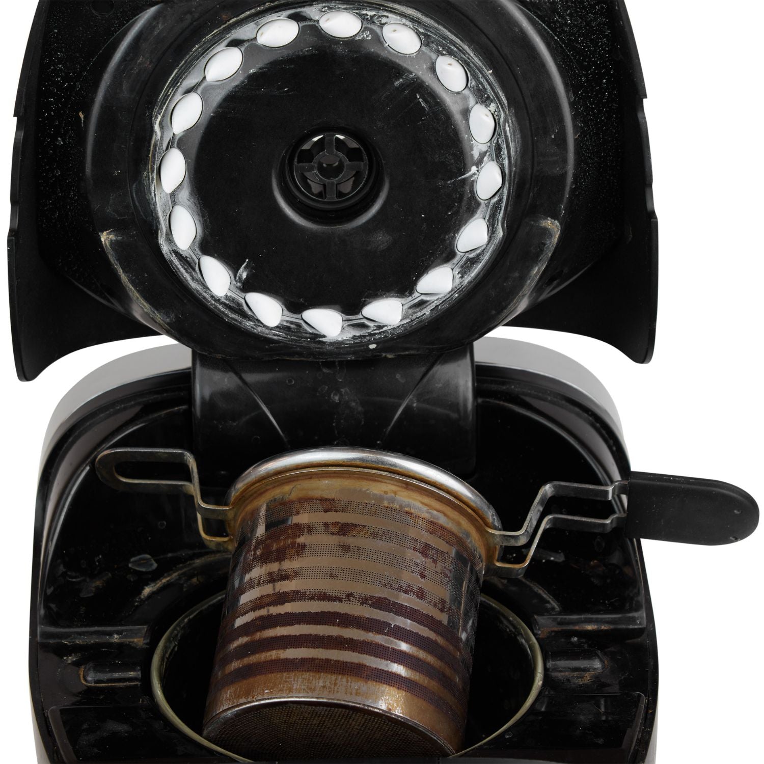 Schritt 2: Befeuchte einen weichen Spüllappen (und gebe wahlweise etwas Spülmittel hinzu), säubere damit vorsichtig die Maschine. Öffne den Deckel, nimm das Sieb und die Glasbrühkammer heraus. Reinige dann das Maschineninnere und den Bereich, wo normalerweise die Glasbrühkammer sitzt.