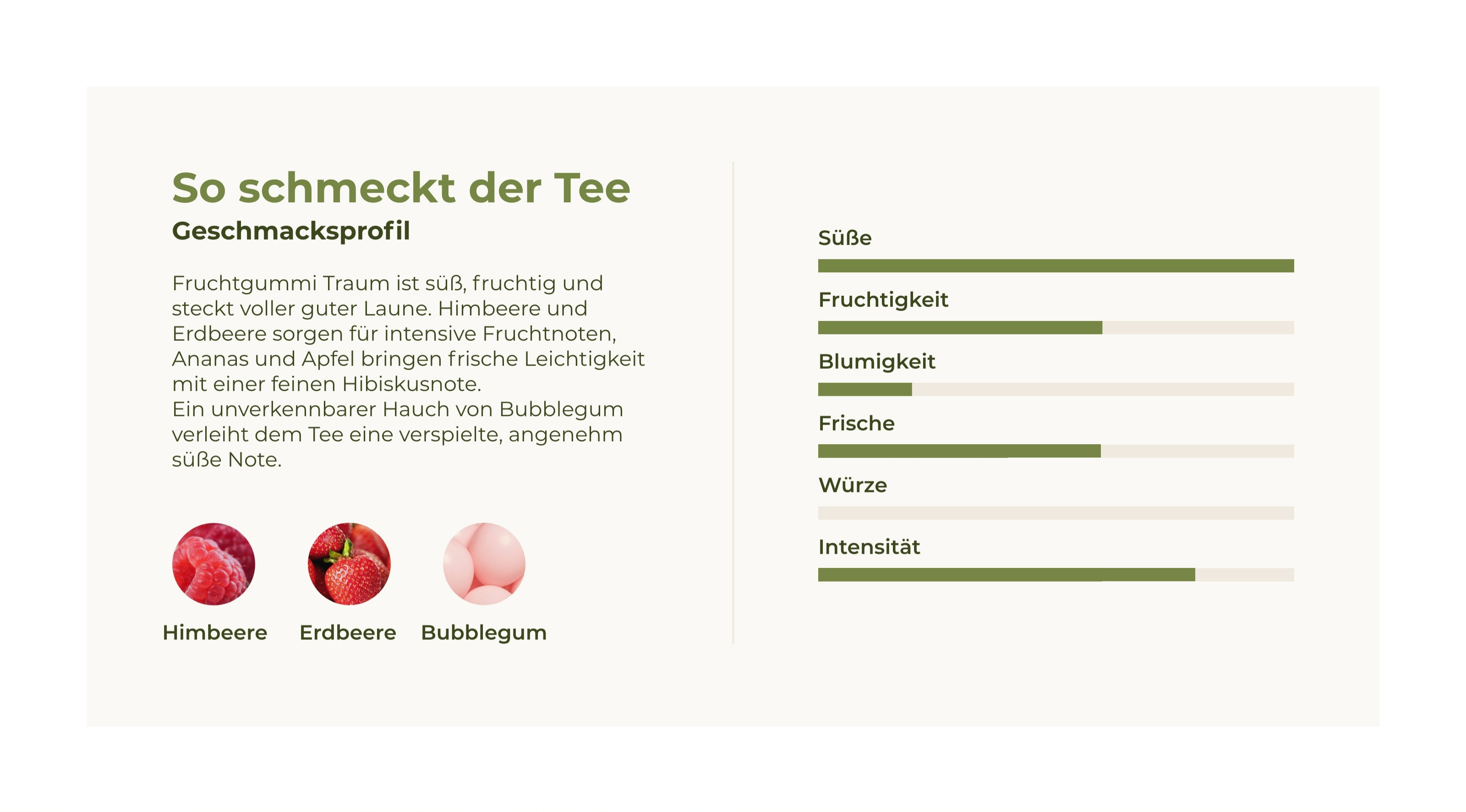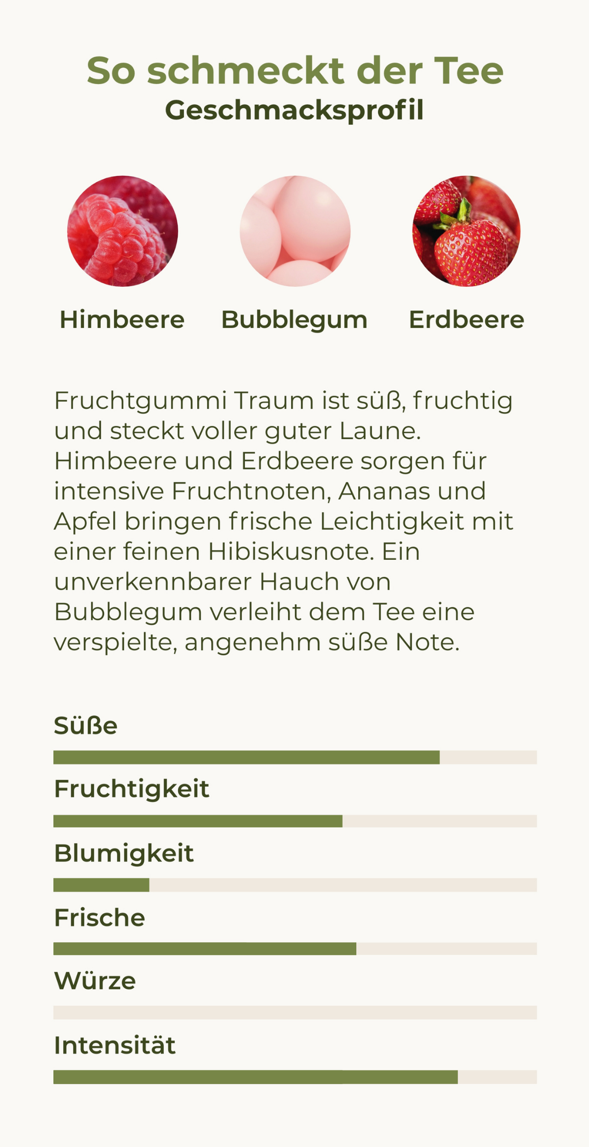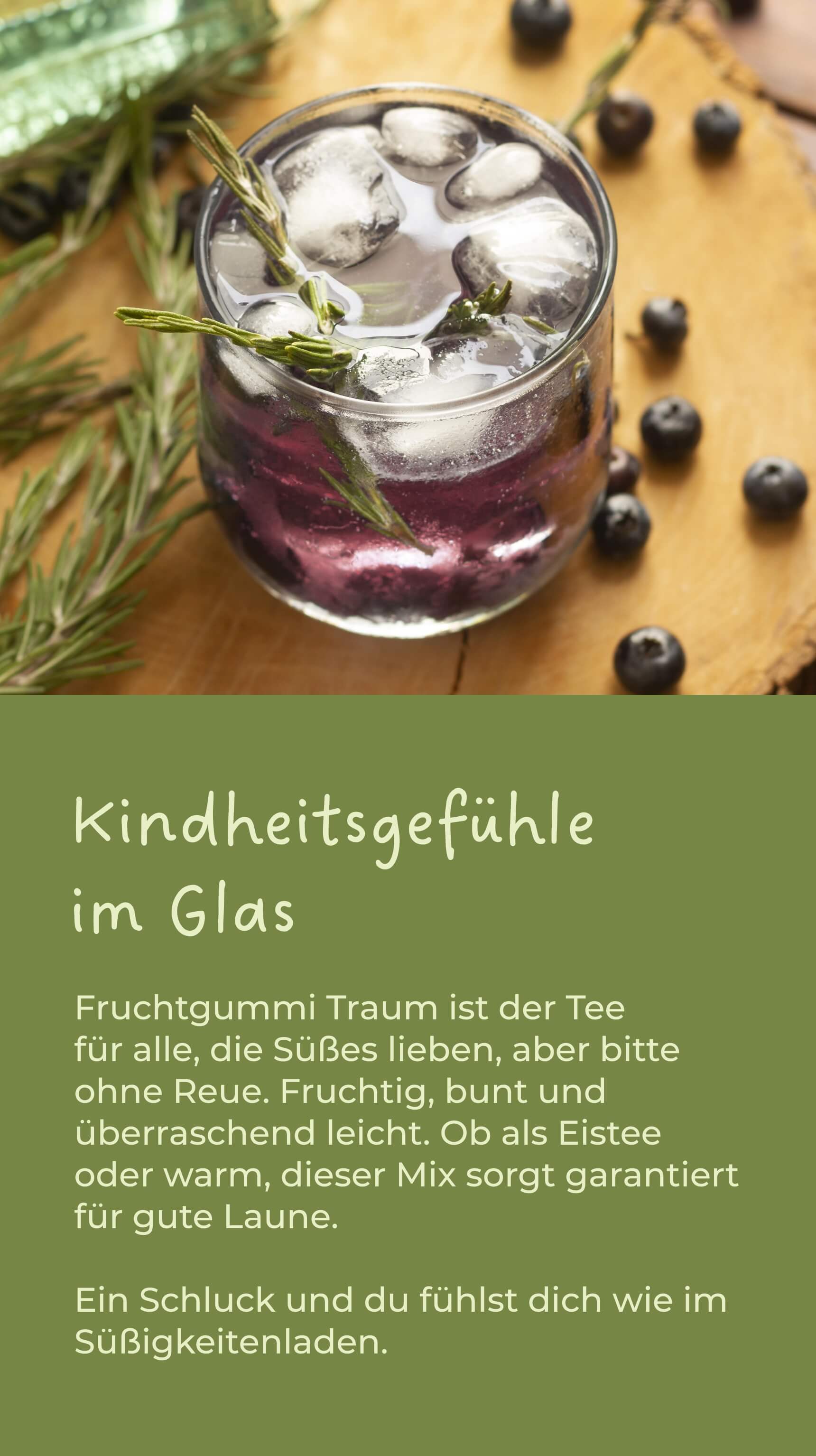 Fruchtgummi Traum ist der Tee für alle, die Süßes lieben, aber bitte ohne Reue. Fruchtig, bunt und überraschend leicht. Ob als Eistee oder warm, dieser Mix sorgt garantiert für gute Laune.
