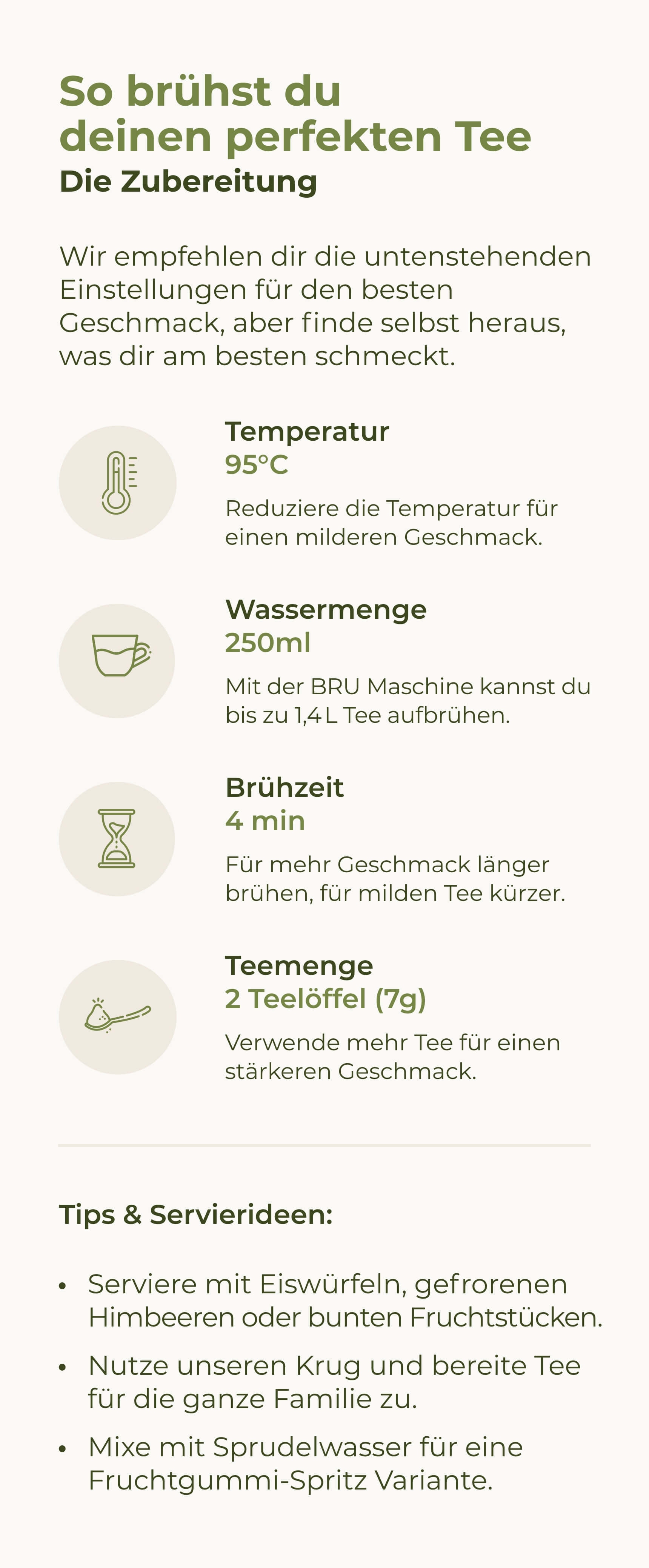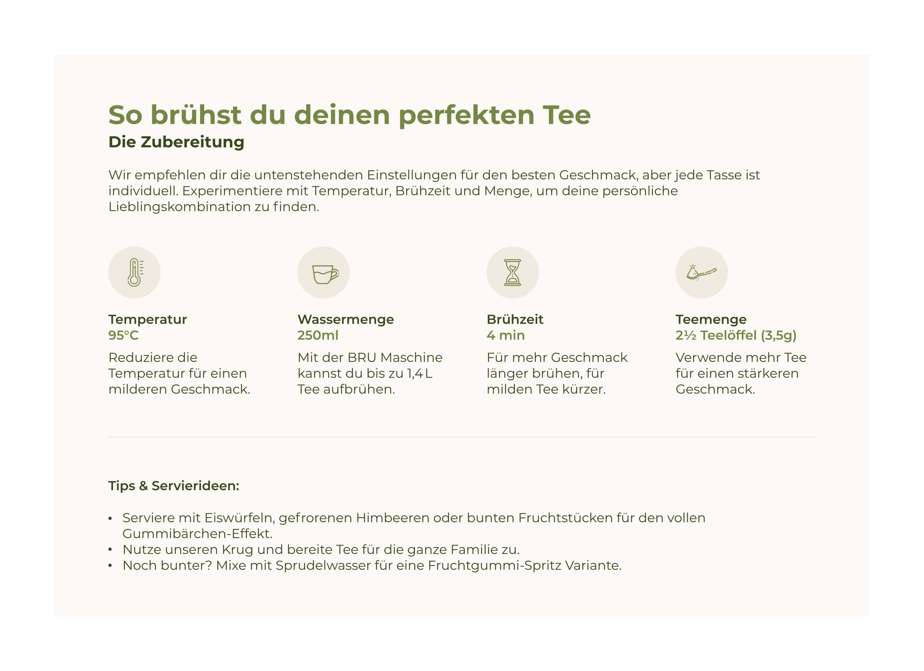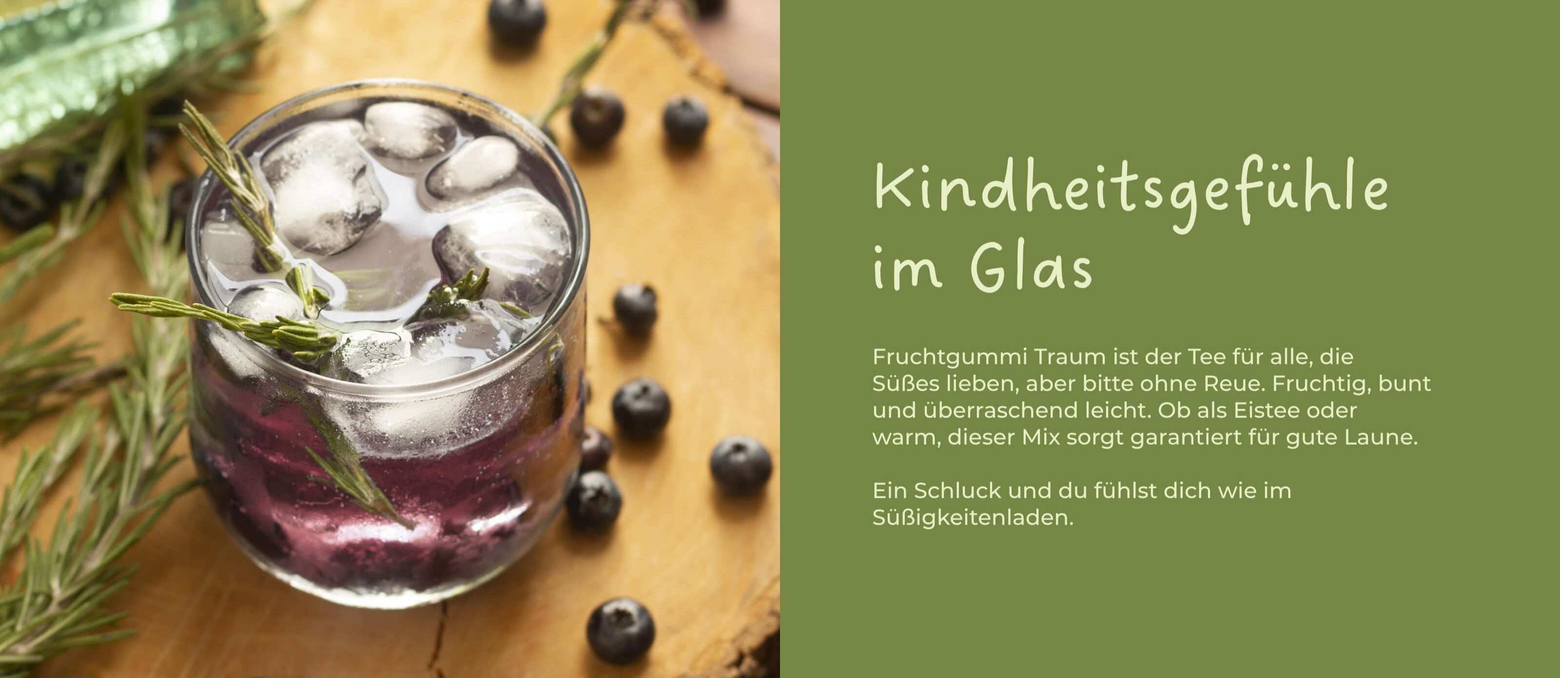 Fruchtgummi Traum ist der Tee für alle, die Süßes lieben, aber bitte ohne Reue. Fruchtig, bunt und überraschend leicht. Ob als Eistee oder warm, dieser Mix sorgt garantiert für gute Laune.