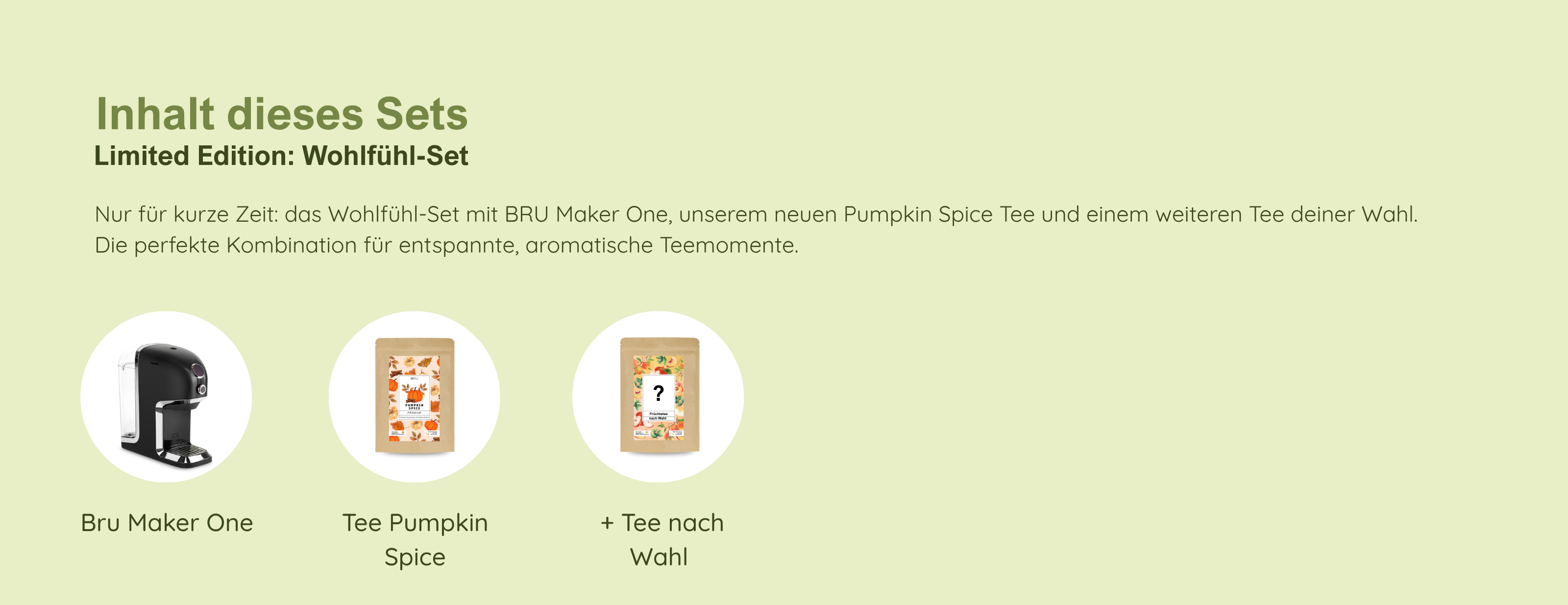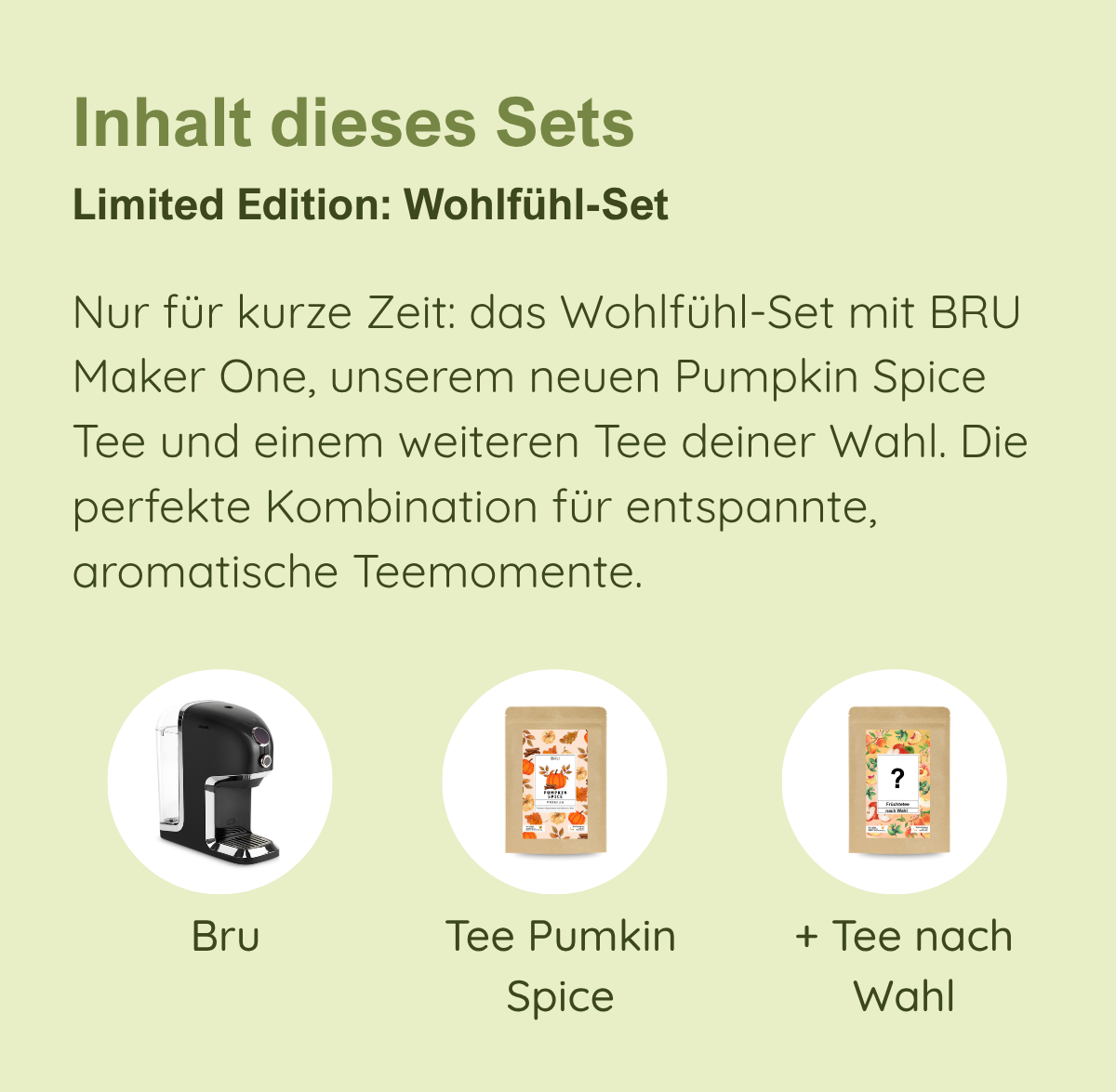 Alles, was du für deine Tee-Auszeit brauchst: der BRU Maker One, unser limitierter Pumpkin Spice Tee und ein weiterer Tee deiner Wahl - im exklusiven Wohlfühl-Set - kostenlos und nur für kurze Zeit!